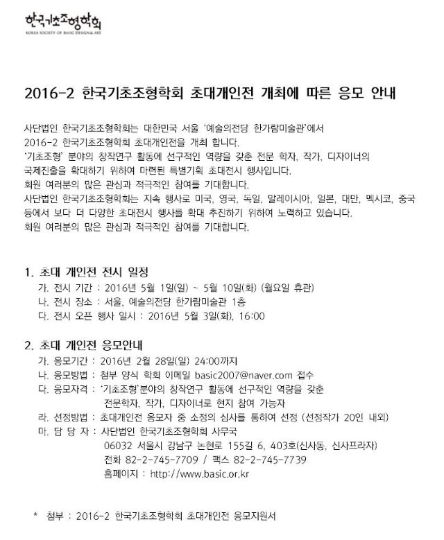 2016-2 한국기초조형학회 초대개인전 개최에 따른 응모 안내