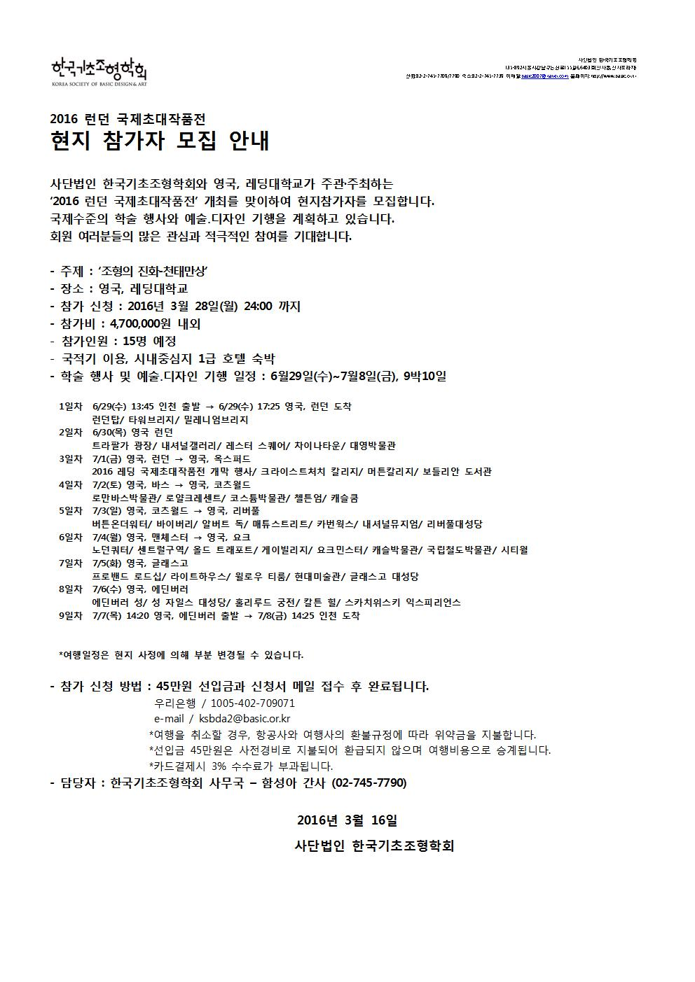 2016 한국기초조형학회 런던 국제초대작품전 현지참가자 모집 안내