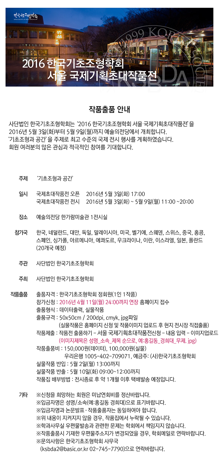 2016 한국기초조형학회 서울국제기획초대작품전 접수마감 연장 안내