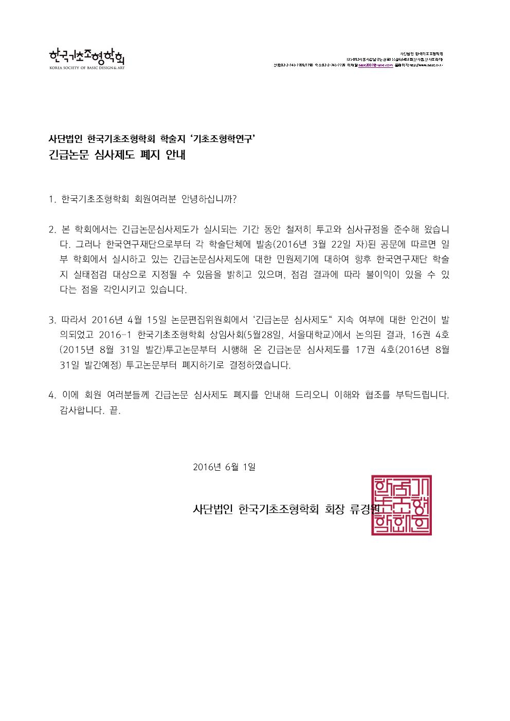 KSBDA '기초조형학연구' 학술지 긴급논문심사제도 폐지 안내