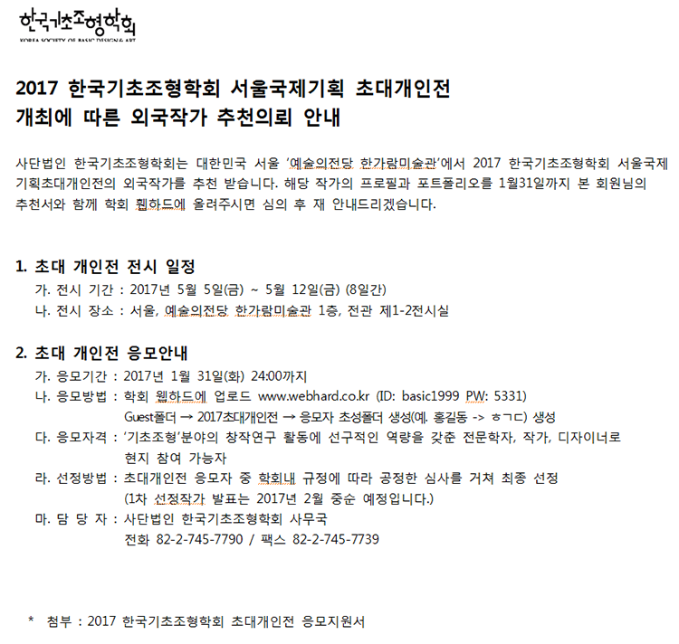 2017 한국기초조형학회 서울국제기획 초대개인전 개최에 따른 외국작가 추천의뢰 안내