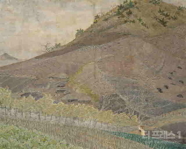 비스듬히 누운 야산에 초가 몇 채, 밭을 가르는 고랑, 머리에 짐을 인 여인, 나무와 울타리까지—그 어떤 부분도 점의 호흡에서 벗어나지 않는다. 토점화(土點畫)의 미학이 한적한 농가 풍경 속에 구현된 것이다.