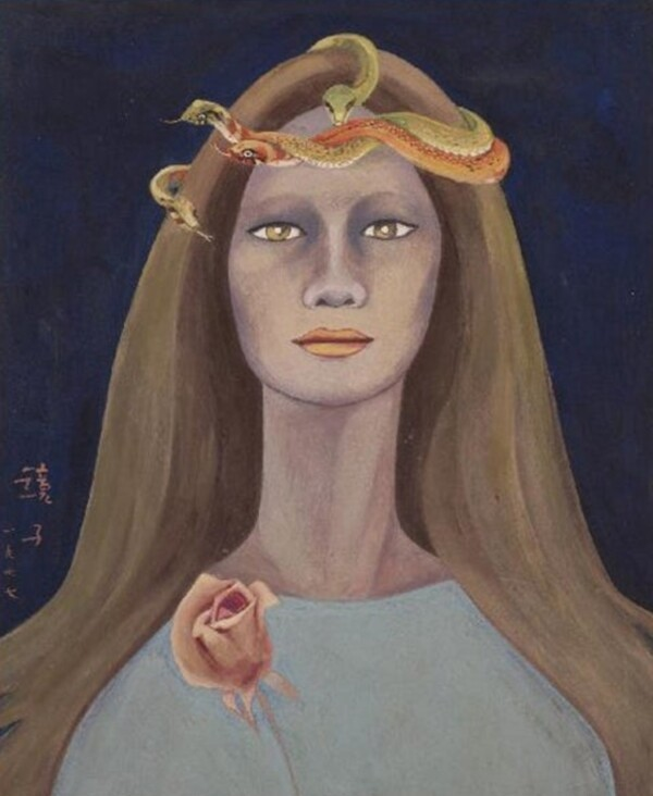 머리 위의 뱀, 가슴의 장미, 어두운 배경, 모두 상징적이다. 뱀은 금기와 욕망, 장미는 아름다움과 상처의 이중성이고, 배경은 심리적 공간이다. 천경자의 원초성은 외부의 낙원을 상상하지 않는 대신에 슬픔을 신화로 전환한다.