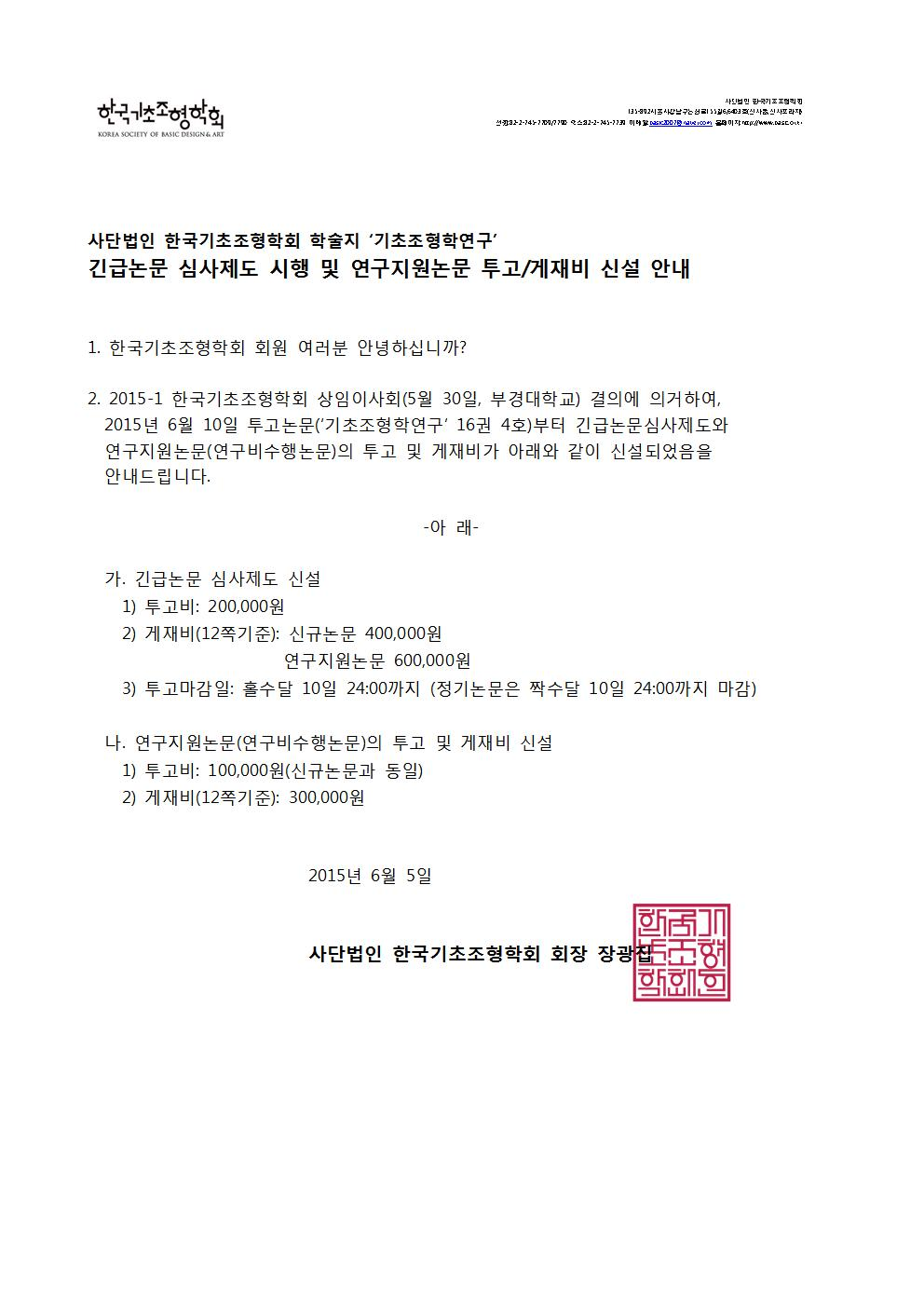 KSBDA '기초조형학연구' 긴급논문 심사제도 시행 및 연구지원논문 투고/게재비 신설 안내