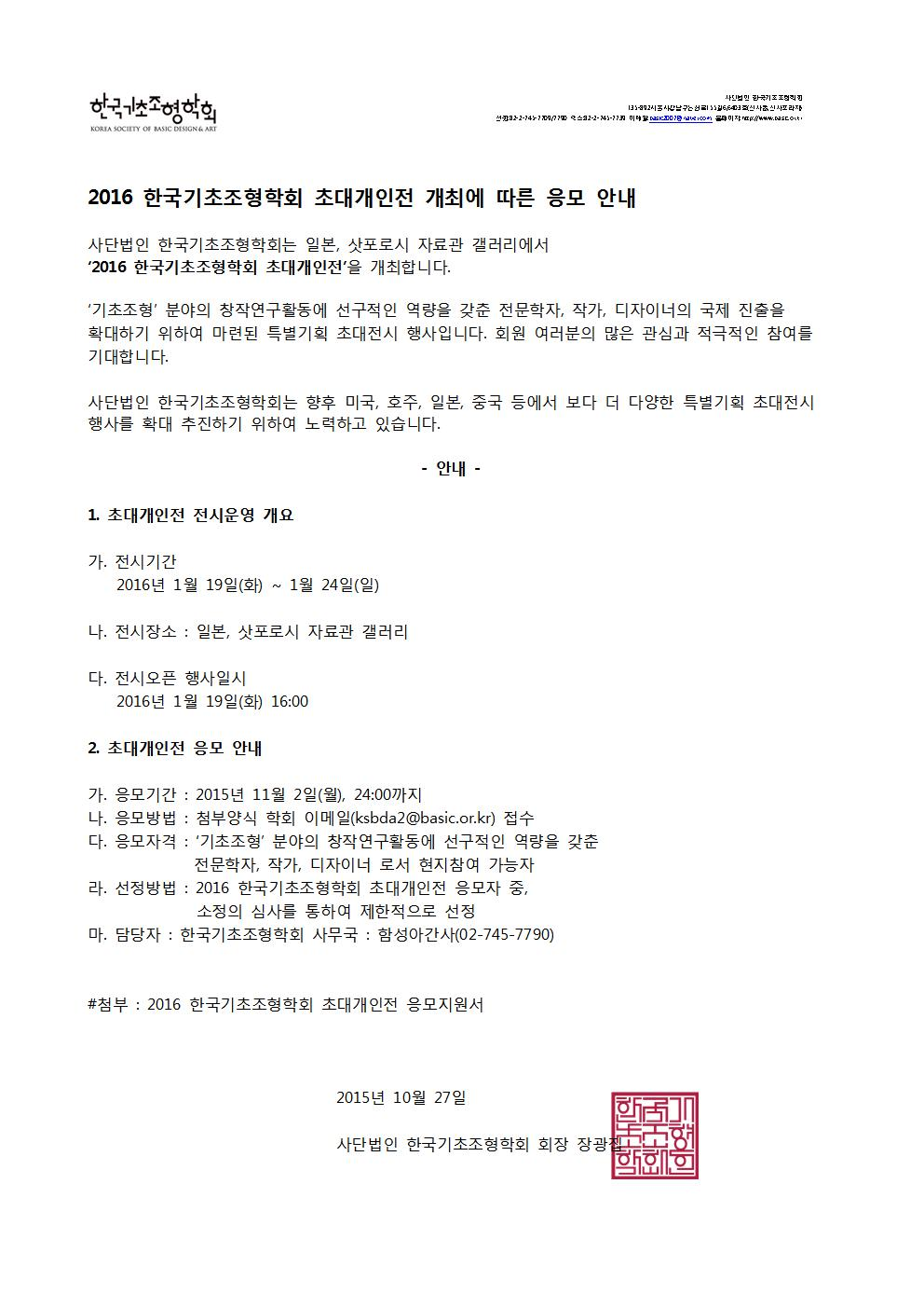 2016 한국기초조형학회 초대개인전 개최에 따른 응모안내