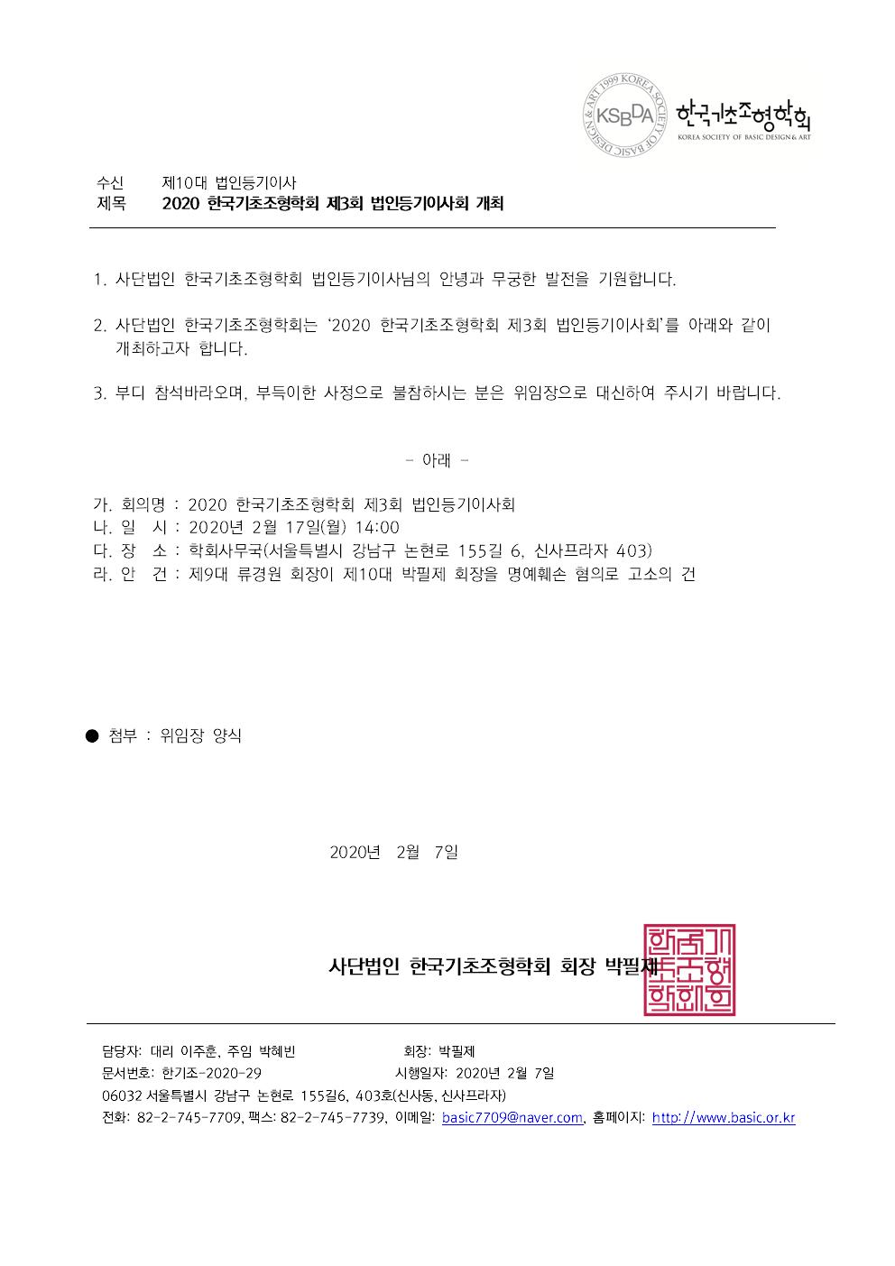 2020 한국기초조형학회 제3회 법인등기이사회 개최 안내