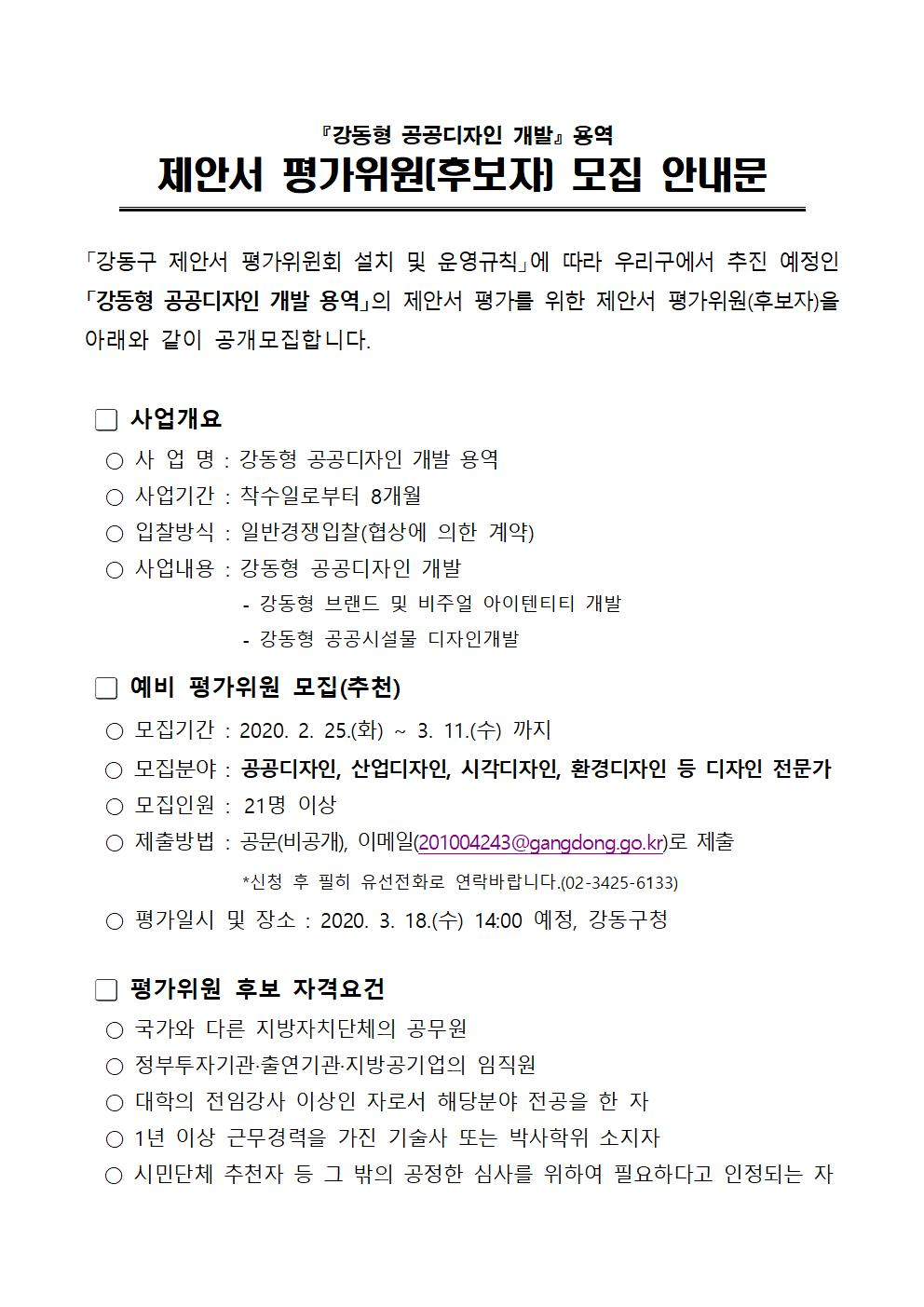 강동형 공공디자인 개발 용역 제안서 평가위원(후보자) 모집 안내문