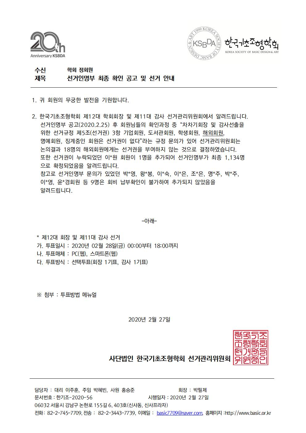 2020 한국기초조형학회 선거인명부 최종확인 공고 및 선거안내(첨부)