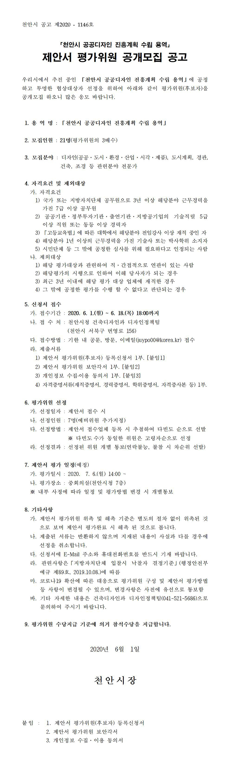 천안시 공공디자인 진흥계획 수립 용역 제안서 평가위원 공개모집 공고