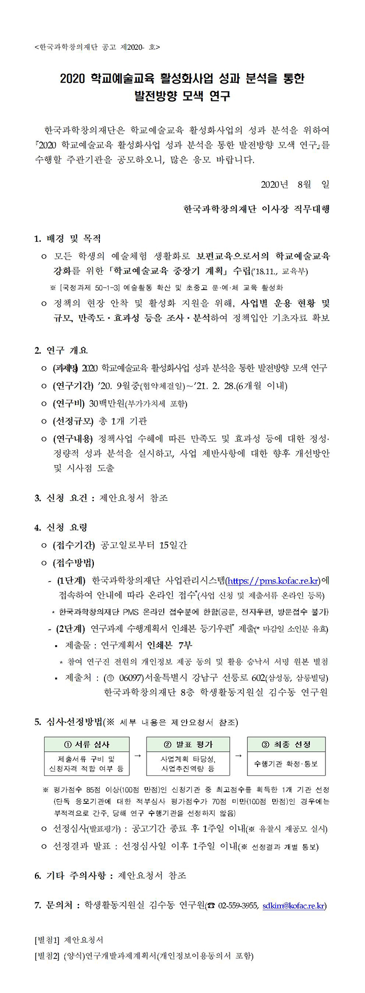 [붙임1] 공고문(2020 학교예술교육 활성화사업 성과 분석을 통한 발전방안 모색 연구).hwp