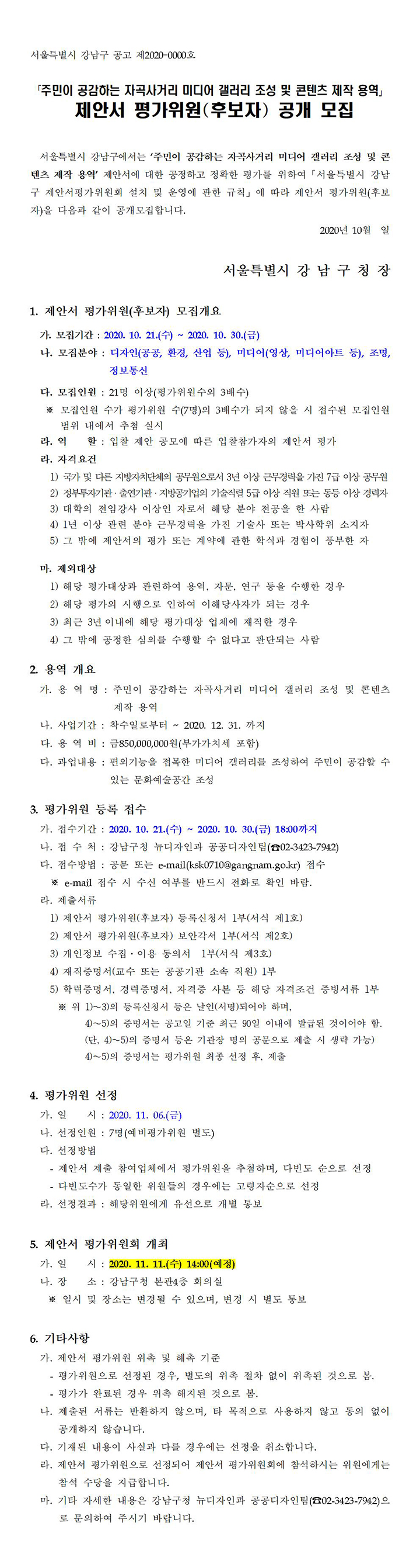 강남구 「주민이 공감하는 자곡사거리 미디어 갤러리 조성 및 콘텐츠 제작 용역」 제안서 평가위원(후보자) 공개 모집안내