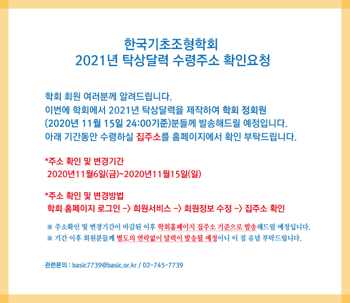 한국기초조형학회 2021년 탁상달력 수령주소 확인 요청 안내드립니다.