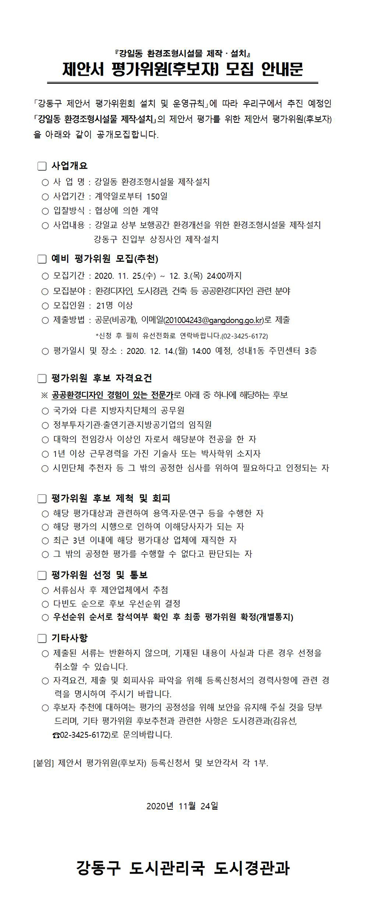 『강일동 환경조형시설물 제작·설치』 제안서 평가위원(후보자) 모집 안내문