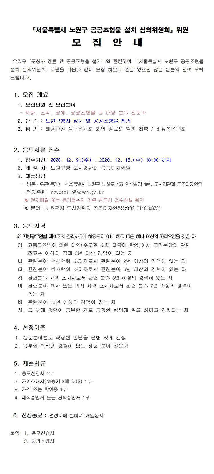 노원구 공공조형물 설치 심의위원회 위원(후보) 모집안내