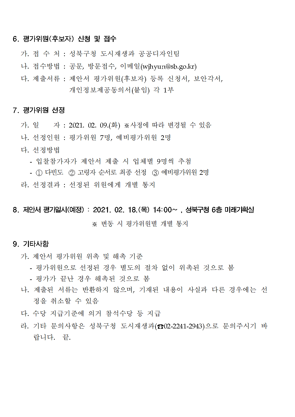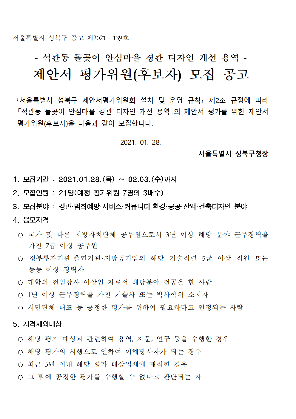서울특별시 성북구 석관동 돌곶이안심마을 경관디자인 개선 용역 제안서 평가위원 추천 요청