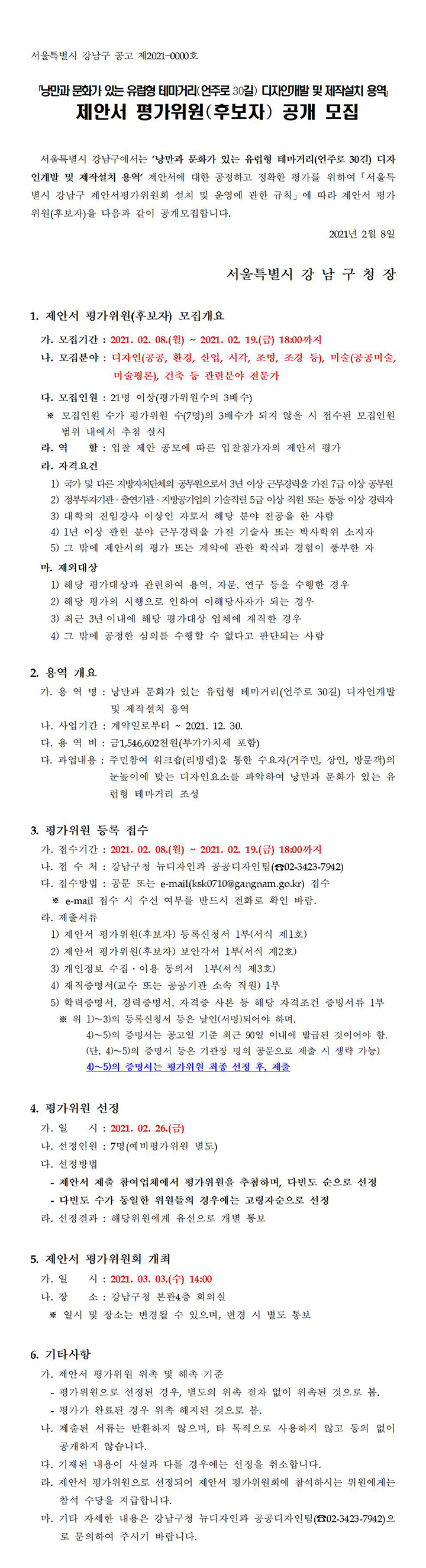 「낭만과 문화가 있는 유럽형 테마거리(언주로 30길) 디자인개발 및 제작설치 용역」 제안서 평가위원(후보자) 공개 모집