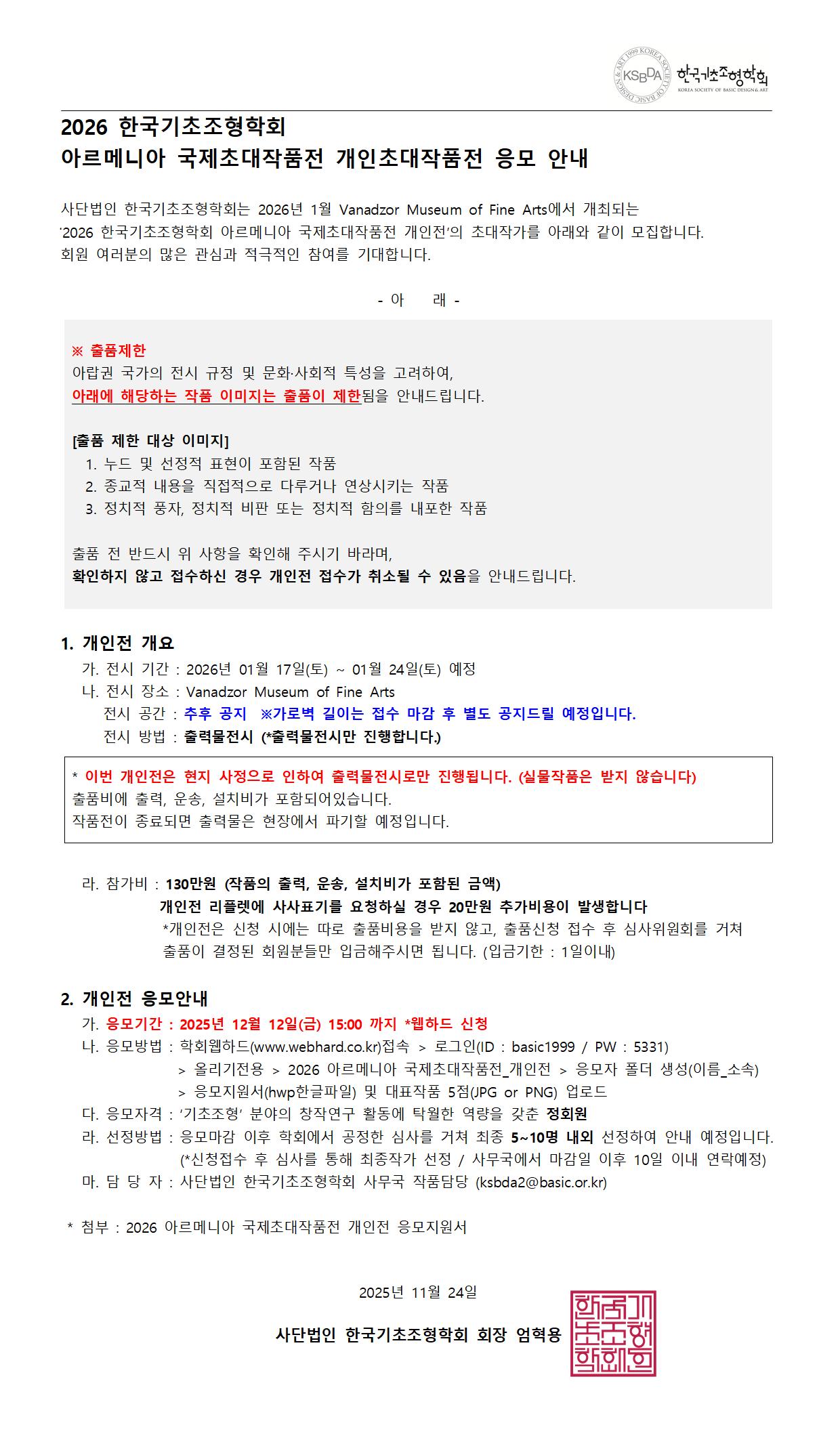 2026 한국기초조형학회 아르메니아 국제초대작품전 개인전 응모안내