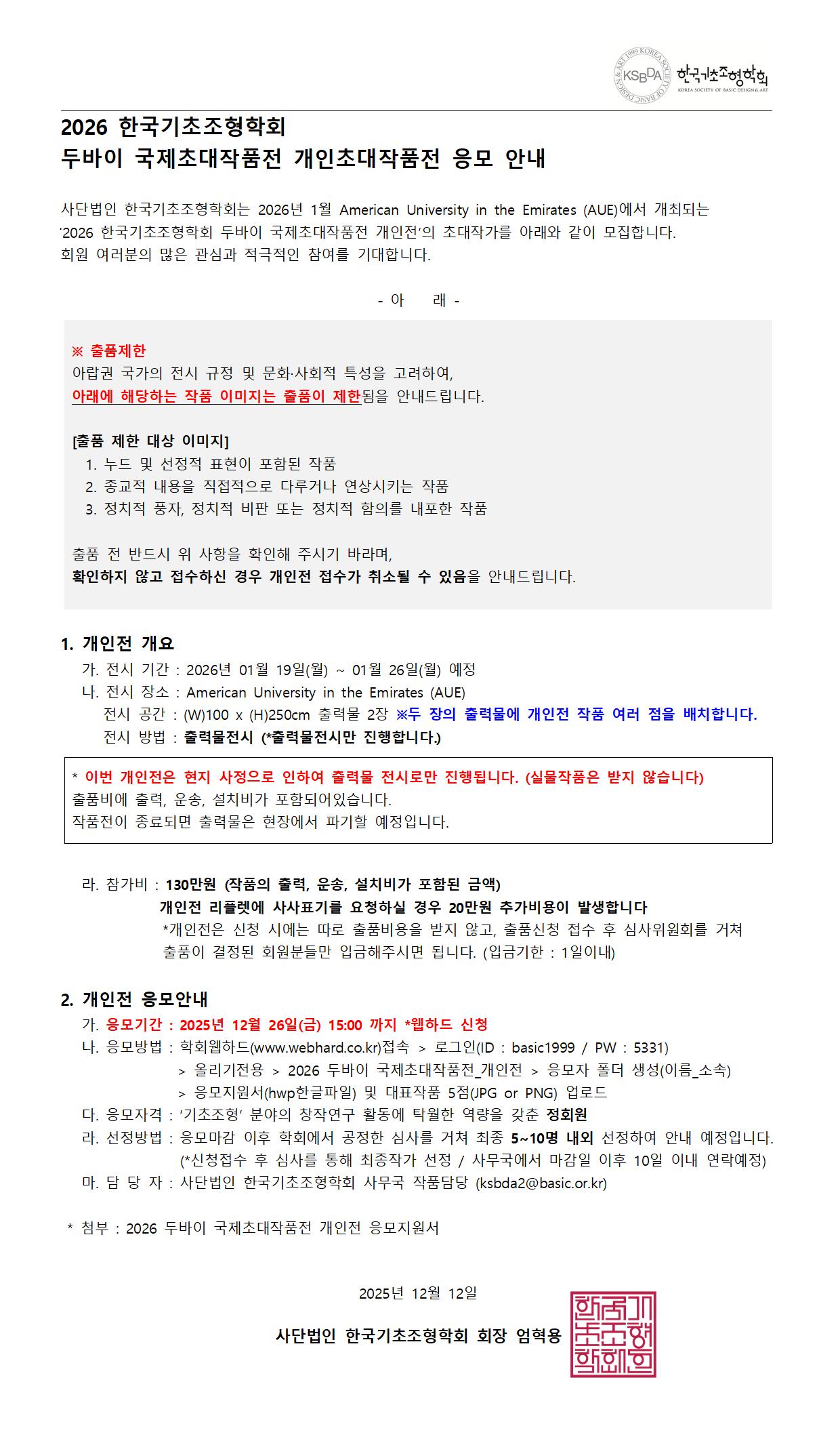 2026 한국기초조형학회 두바이 국제초대작품전 개인전 응모 안내