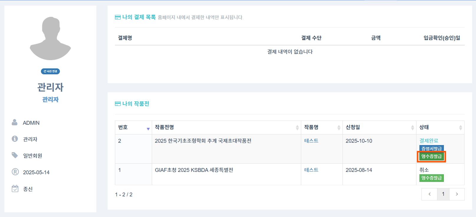 원하는 전시의 [영수증 발급] 버튼을 클릭합니다.