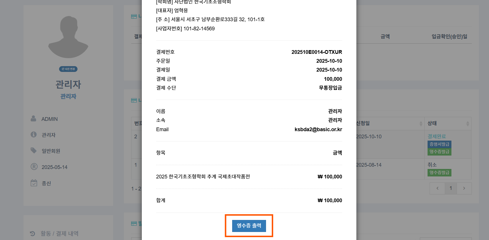 • 팝업창 하단의 [영수증 출력] 버튼을 통해 종이로 출력하거나 PDF 파일로 저장하여 사용하시기 바랍니다.