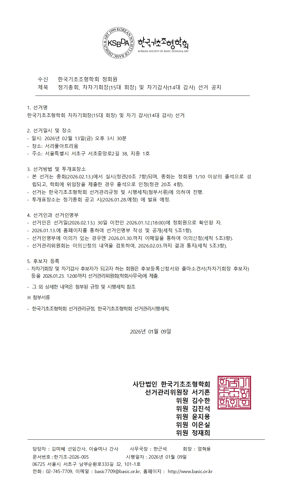 한국기초조형학회 차차기회장(15대 회장) 및 차기 감사(14대 감사) 선거 입후보자 등록 안내