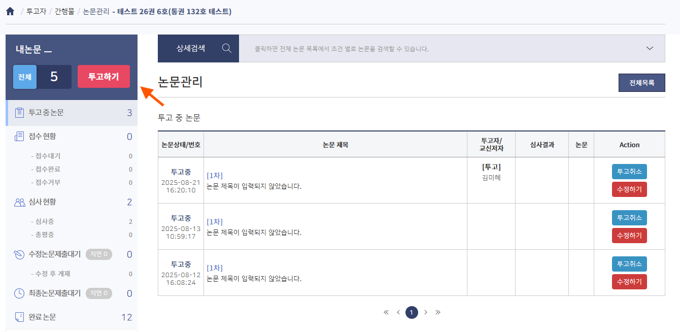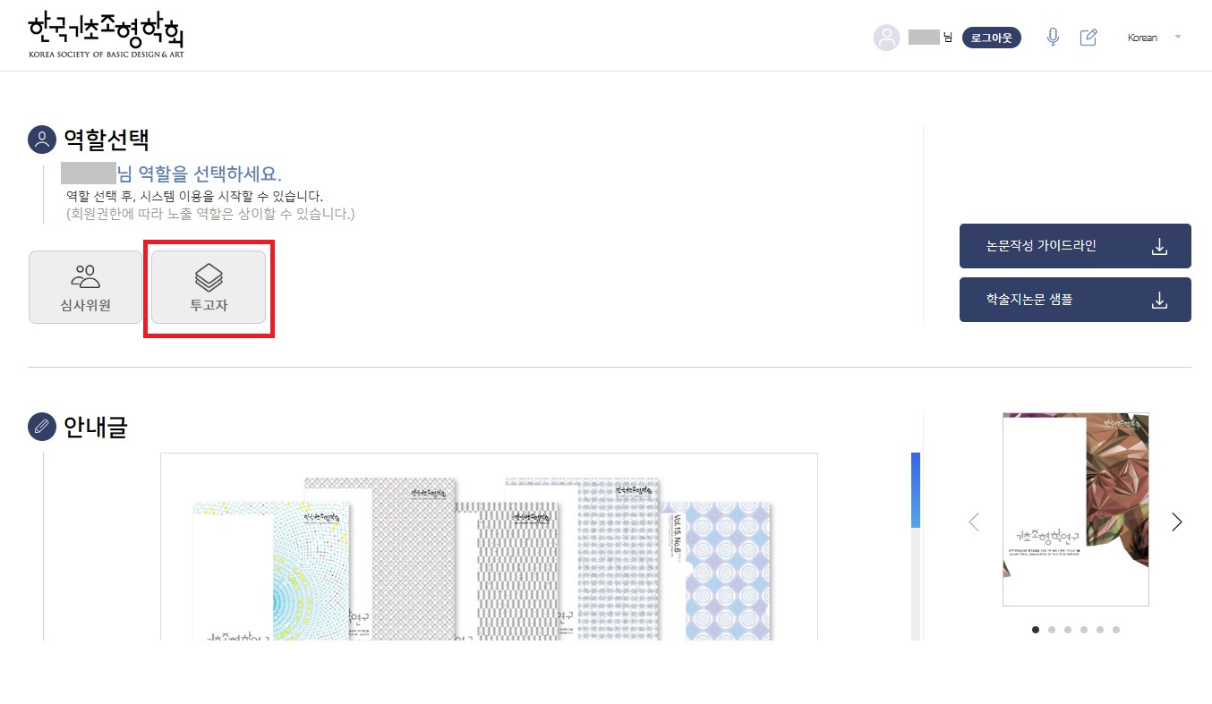 논문투고시스템 로그인 후 [투고자] 역할선택