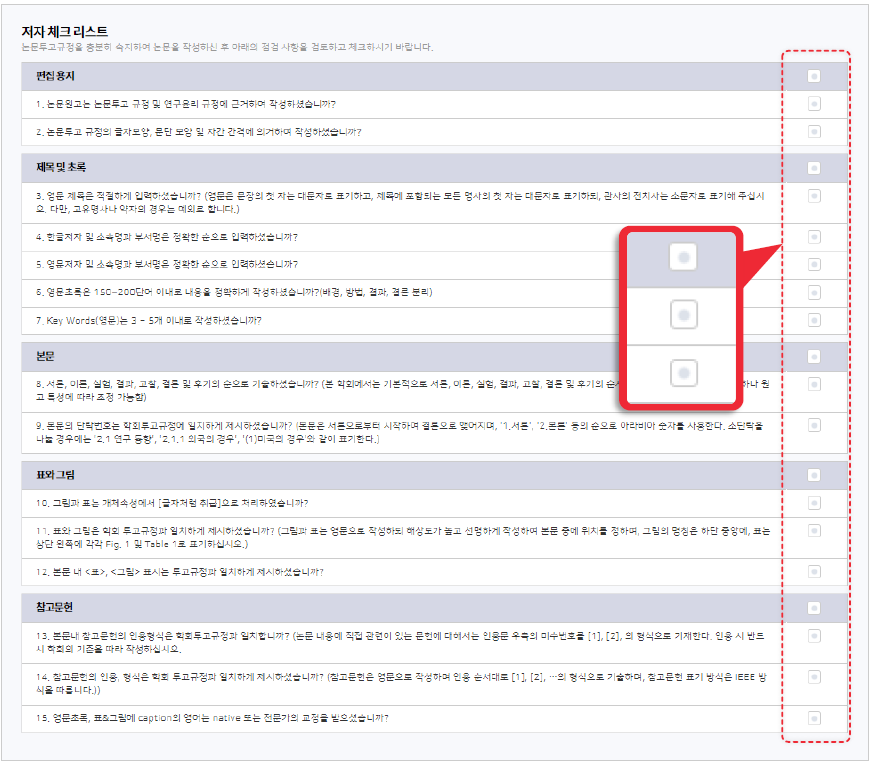 ① 연구윤리서약과 저작권이양동의 내용을 확인하고 '동의함'에 체크해주세요.
