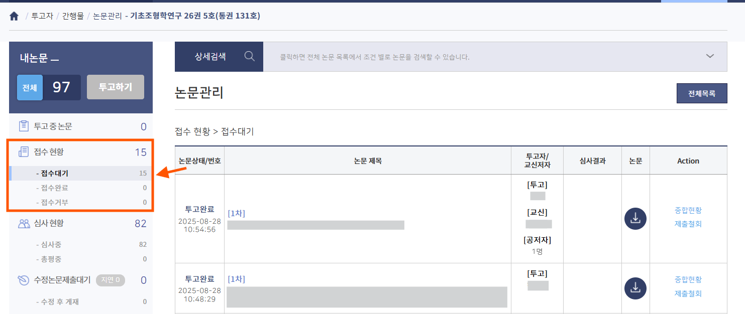 반드시 접수현황-접수대기에서 논문이 조회되는지 확인해주세요.
