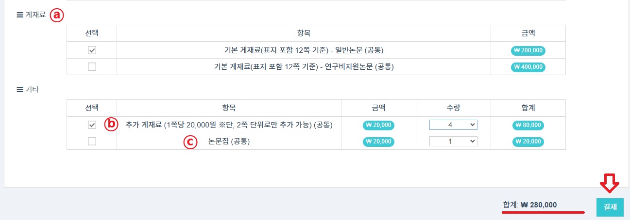 결제항목에서 해당하는 논문게재료를 선택하고, 최종 결금액 확인 후 결제버튼을 눌러 결제합니다.