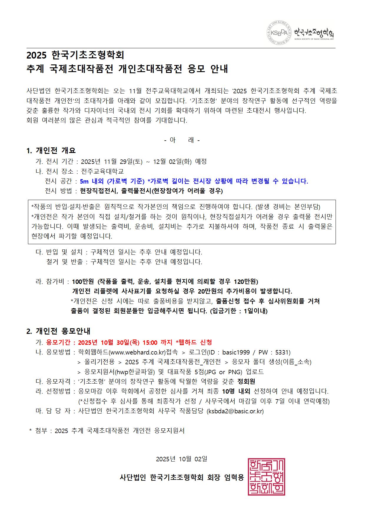 2025 한국기초조형학회 추계 국제초대작품전 개인전 응모안내
