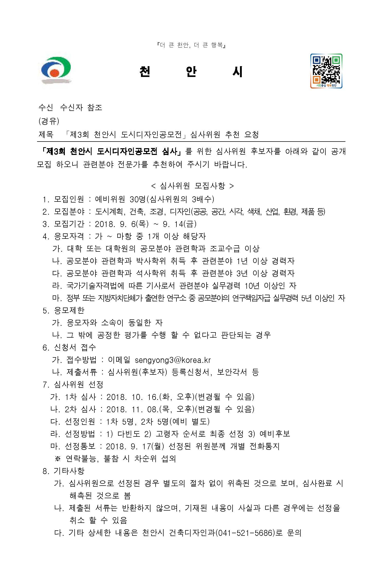 「제3회 천안시 도시디자인공모전」심사위원 추천 요청