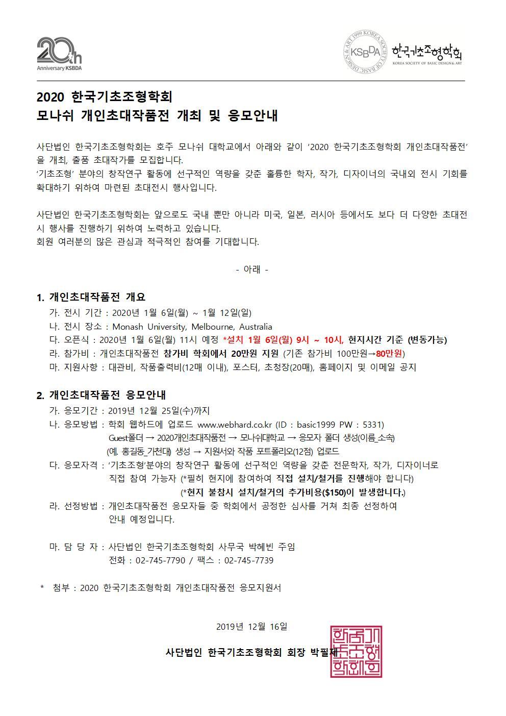 2020 모나쉬 개인초대작품전 개최 및 응모안내