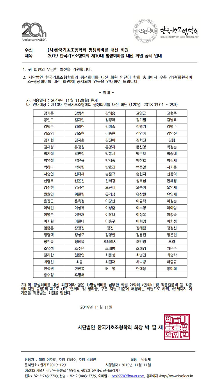 2019 한국기초조형학회 제10대 평생회비를 내신 회원 공지 안내
