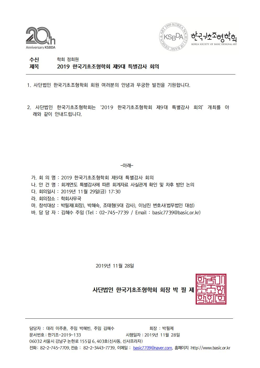 2019 한국기초조형학회 제6회 법인등기이사회 개최안내