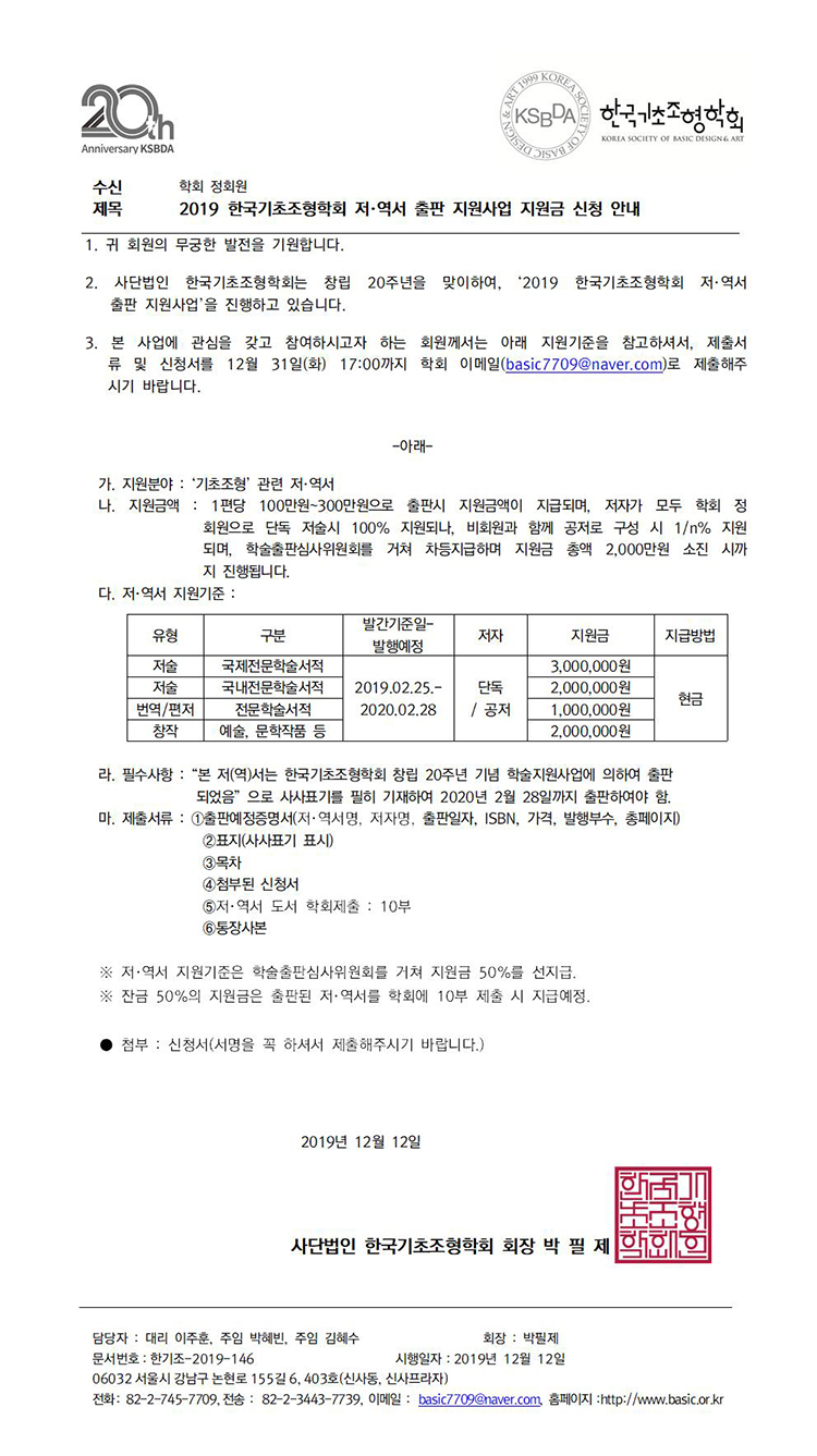 2019 한국기초조형학회 저·역서 출판 지원사업 지원금 신청 안내