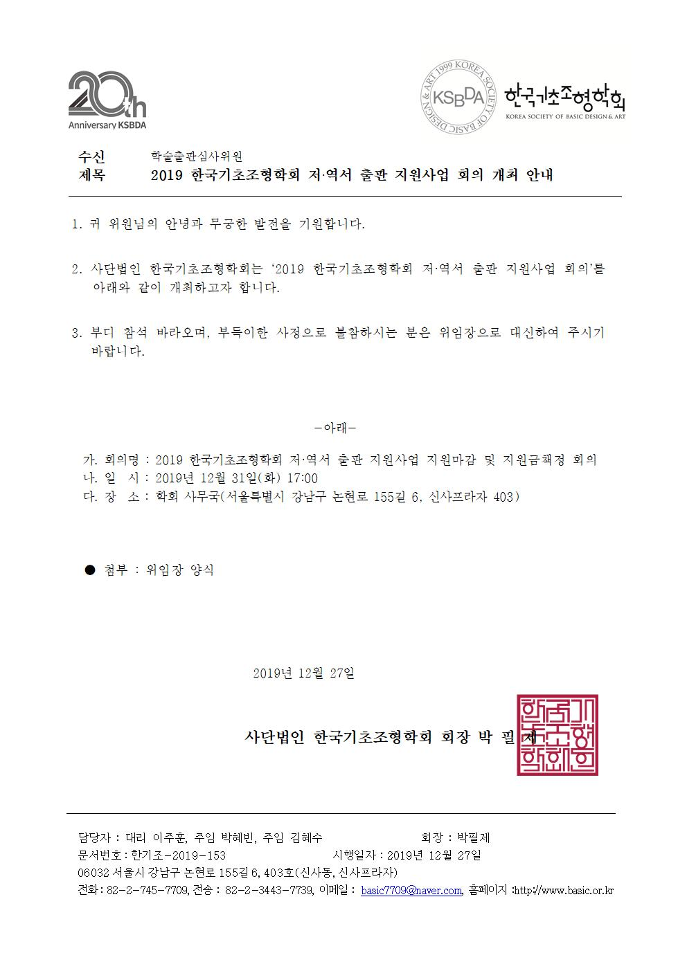 2019 한국기초조형학회 저역서 출판 지원사업 회의 개최 안내